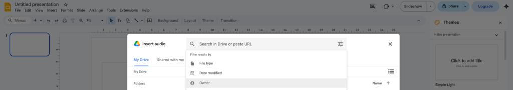 - Step 4 – Access the Insert Audio menu: From the top toolbar, click Insert, then hover over or click Audio. You’ll see your Google Drive files displayed in the selection window.