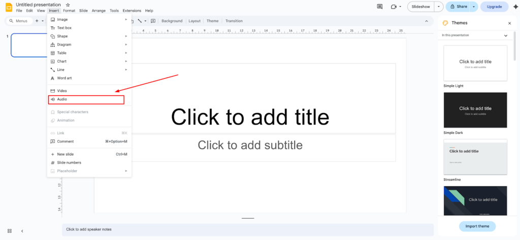 - Step 4 – Insert the audio into your slide: Open your Google Slides presentation and go to the slide where you want the audio. Click Insert in the top menu, then select Audio. A window will pop up showing your Google Drive files. Find your uploaded narration, click on it, and hit Select. The audio will appear as a small speaker icon on your slide.