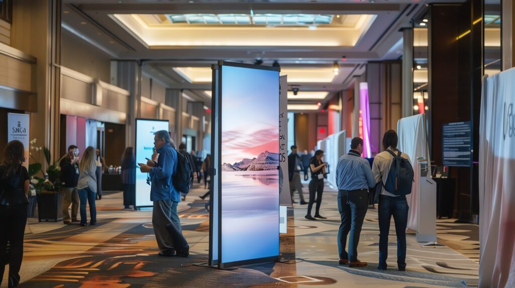 Display screens come in sizes ranging from 32 inches for registration desks to 98 inches for keynote stages. The screen itself represents only part of the package. Professional-grade panels include: