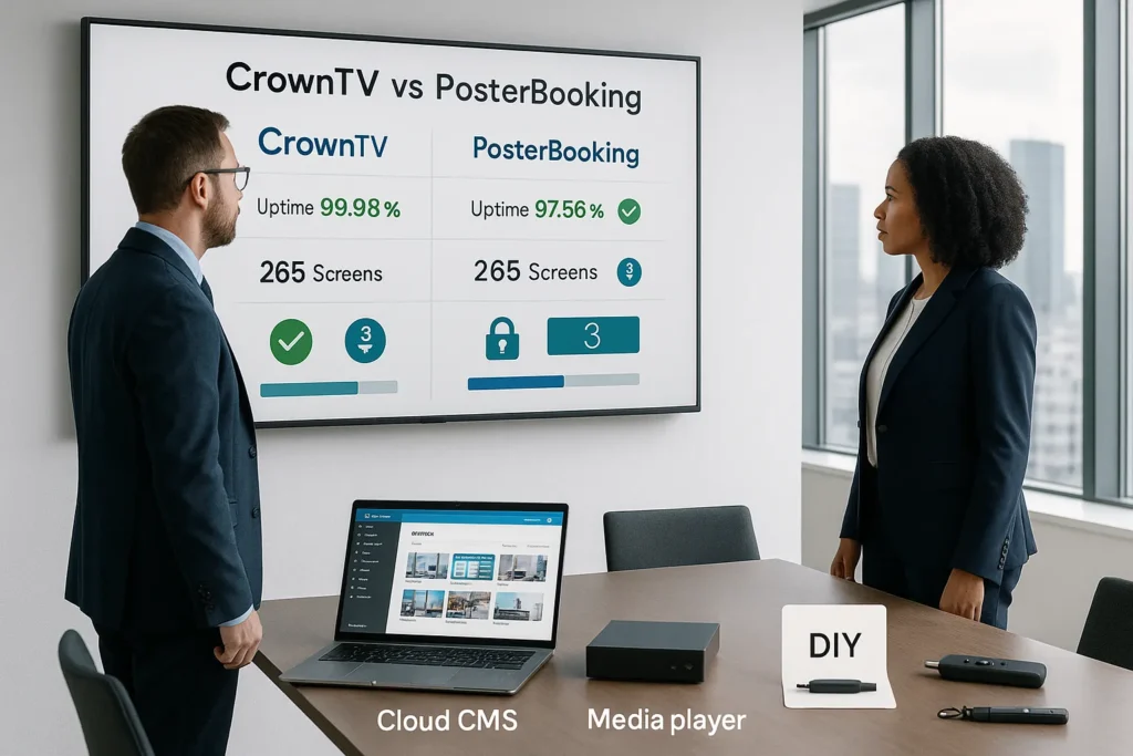 That’s the real gap between a free/low-cost DIY platform and an enterprise-grade, turnkey provider. In this CrownTV vs PosterBooking comparison, we’re going to look at what each solution does well, where each one can feel limiting, and how to decide based on uptime expectations, scale, security, and the true cost of keeping screens running.