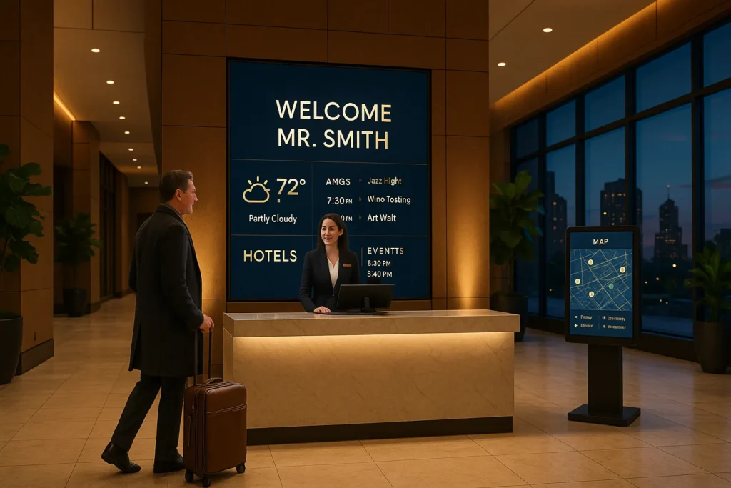 A guest walks into a five-star hotel lobby and is greeted by a sleek, floor-to-ceiling display showing a personalized welcome message, local weather, and curated event recommendations. No printed flyers. No cluttered bulletin boards. Just a seamless first impression that sets the tone for their entire stay.