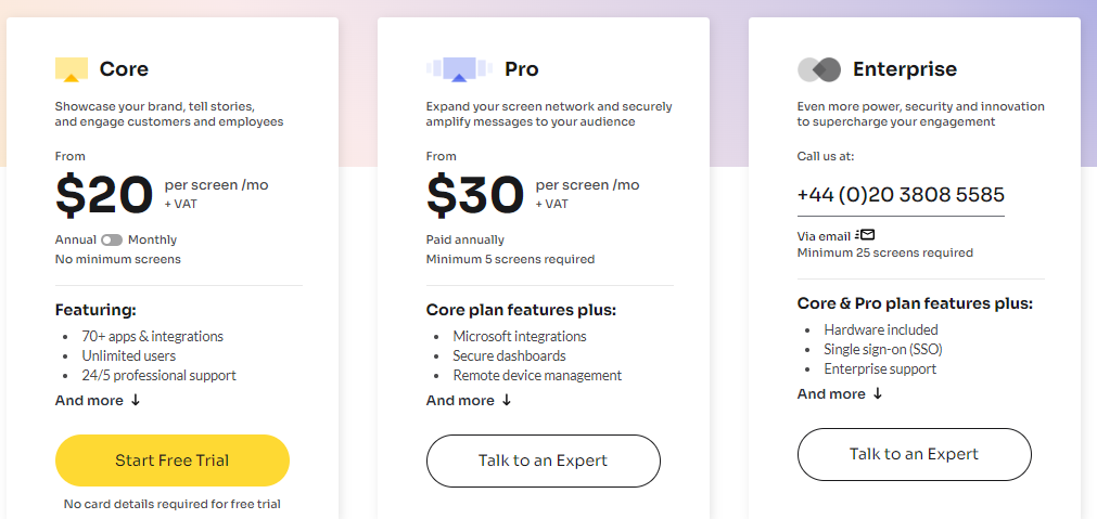 - Core Plan: Includes essential features for small-scale deployments for $20 per screen/mo+VAT.