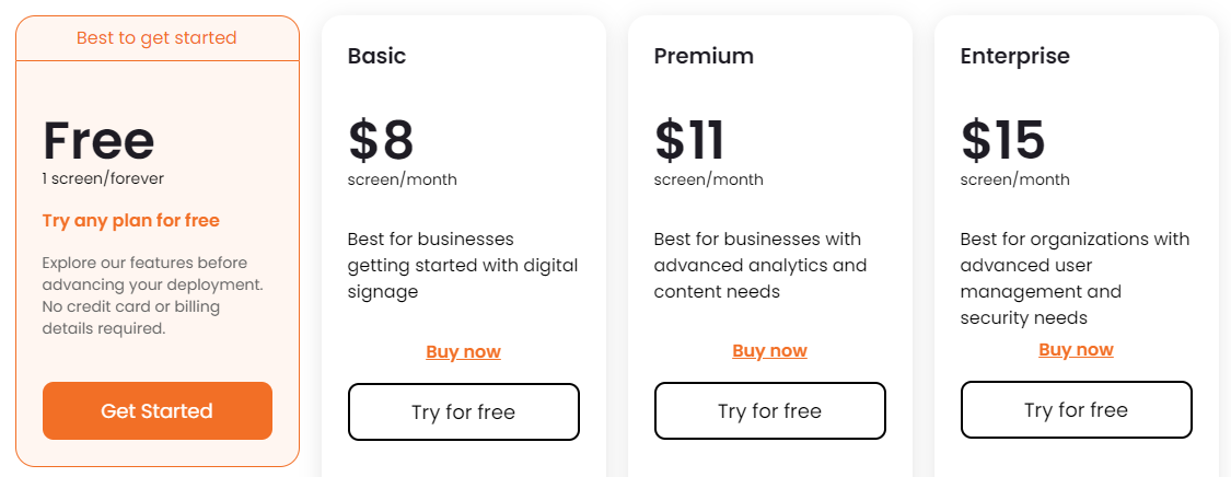 - Basic Plan: Ideal for small-scale deployments, offering essential features to get started with digital signage.